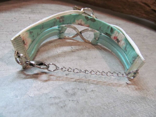Deze handmade meisjesarmband Infiniy is gemaakt van Suede-leer, sierband met bloemmotief, satijndraad, metalen jasseron-, kapjes en karabijnsluiting.