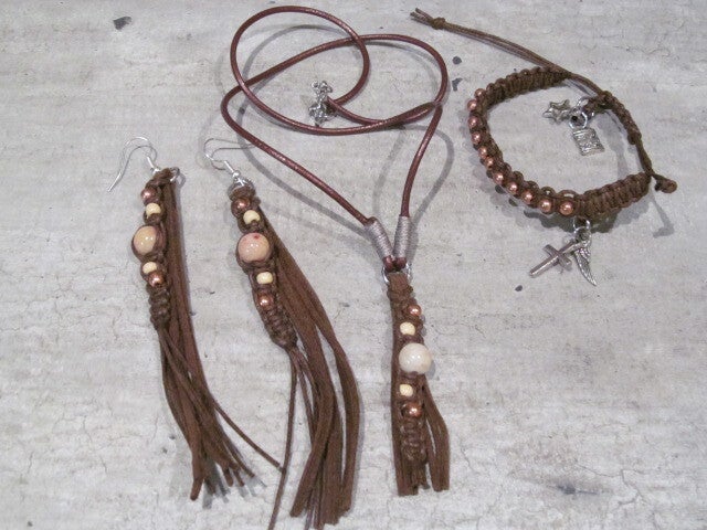 Deze handmade sieradenset Gipsy, bestaande uit ketting, oorbellen en armband, is gemaakt van bruin leer, suede leer, metalen oorhaken en karabijnslot, kralen en bedeltjes kruis, slotje, ster, veertje en kralen.