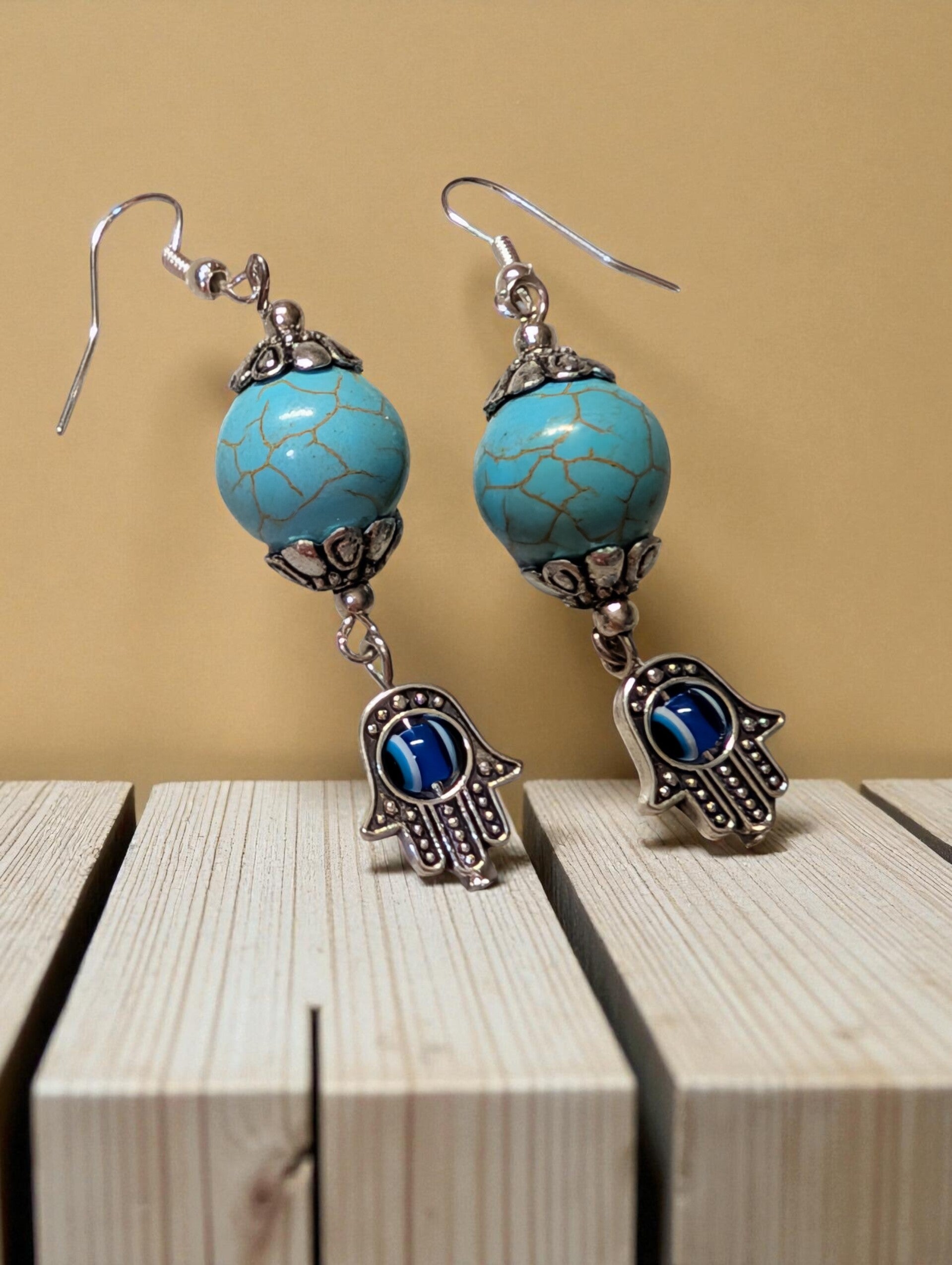De oorbellen Hand van Fatima zijn meer dan alleen sieraden — ze dragen een diepe symboliek van bescherming, geluk en positieve energie. Deze handmade oorbellen zijn gemaakt van metaal met natuursteensoort Turquoise Howlite kralen, en afgewerkt met metalen Franse oorhaken. De combinatie van het spirituele symbool en de turquoise steen zorgt voor een krachtig én stijlvol geheel.