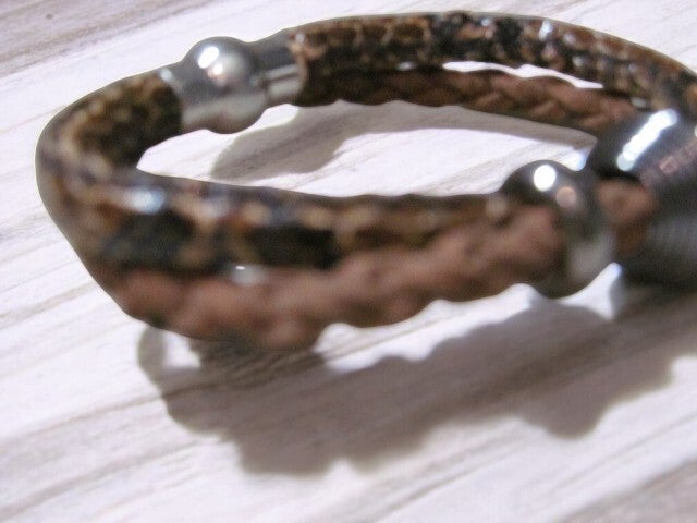 Deze stijlvolle herenarmband combineert een natuurlijke, stoere uitstraling met modern design. De dubbele band bestaat uit gevlochten bruin leer en een slangenprint-accent, afgewerkt met een robuuste metalen middenkraal en strakke metalen details. De armband heeft een comfortabele pasvorm van 19–20 cm en sluit moeiteloos aan om de pols.