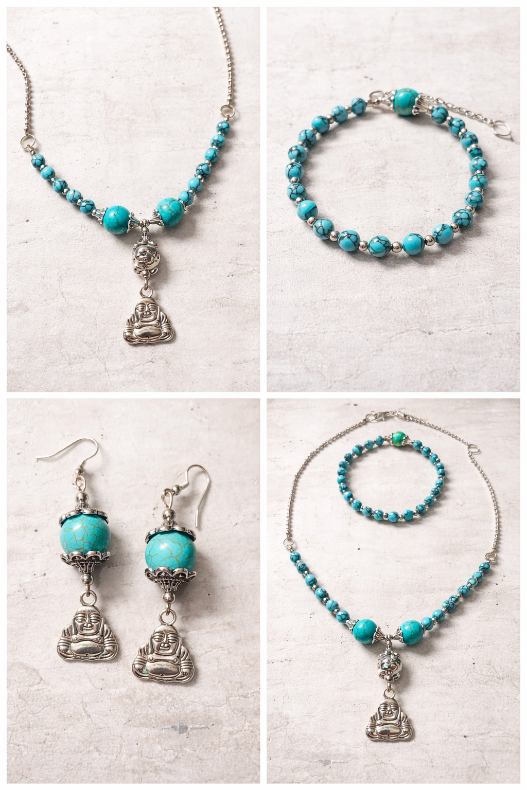 Deze handgemaakte turquoise damesset bestaat uit een ketting, armband en oorbellen die perfect op elkaar zijn afgestemd. De combinatie van turquoise kralen en zilverkleurige accenten zorgt voor een rustige, elegante uitstraling. Ideaal als complete set of als bijzonder cadeau.