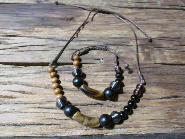 Deze handgemaakte sieradenset natuurstenen ketting en armband combineert diepe zwarte onyx kralen met warme hout- en aardetinten. De opvallende tijgeroog-look middenkraal vormt het krachtige middelpunt en geeft de ketting een rustige, natuurlijke uitstraling met een stoer randje. De metalen accenten zorgen voor extra karakter zonder de balans te verstoren.
