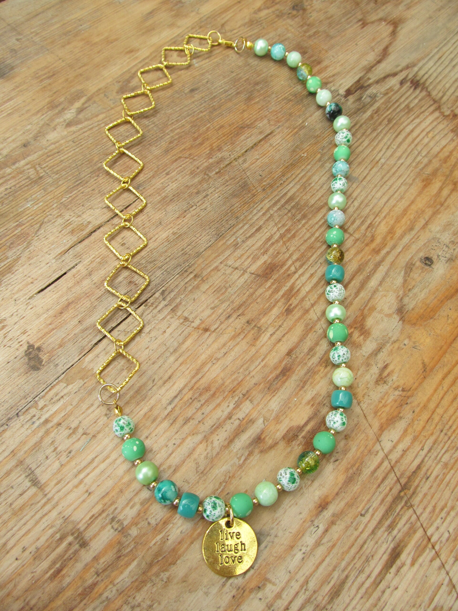 Deze unieke handgemaakte ketting combineert natuurlijke groentinten met een speelse gouden schakel en een inspirerende “Live Laugh Love” hanger. Een stijlvolle eyecatcher die niet alleen je outfit compleet maakt, maar ook een positieve boodschap uitstraalt.