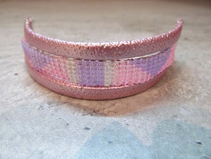 Deze handmade meisjesarmband Pink is gemaakt van 3 kleuren suede leer, gevlochten koord, metalen jasseron, eindkapjes, karabijnsluiting, hangertjes en diverse soorten kralen,